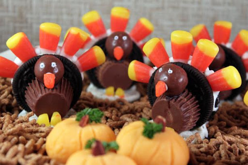3. For the second cookie. Stick some candy corn into the Oreo 'stuff' along one edge for the feathers -- pointy side down. They should fan out around the edge. If you have trouble doing this, you can help them stick with some white frosting.