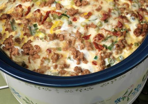1 Spray a 6 quart slow cooker with cooking spray or use a slow cooker liner (reynolds makes these) Layer 1/2 of the potatoes on the bottom of slow cooker, half of the sausage, 1/2 the mozzarella and Parmesan cheese, 1/2 the sun dried tomatoes and green onion. Repeat with the remaining half of the same ingredients. 2 Beat eggs, milk, salt and pepper and cayenne in large bowl with a wire whisk until well blended. 3 Pour evenly over potato-sausage mixture.Cook on low setting for 8 hours or on high setting for 4 hours or until. 4 eggs are set.