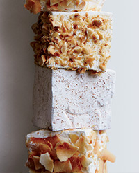 These delicious marshmallows from pastry chef Dominique Ansel are made by whipping a hot sugar syrup with gelatin; they're just dense enough to be perfect for toasting over a fire. They're delicious plain, or with any of the following flavorings: cinnamon, hazelnut or coconut-lime.