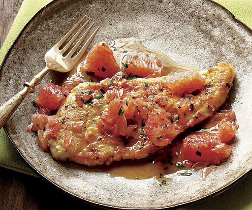Add the wine to the skillet and boil until reduced by half, scraping the bottom of the skillet with a wooden spatula to loosen any browned bits, about 2 minutes. Add the chicken broth and boil until reduced by half, 2 to 3 minutes. Lower the heat to low. Add the butter and the pomelo pieces and juice and cook, stirring and shaking the pan, until the butter is incorporated, about 1 minute. Season to taste with salt and pepper.