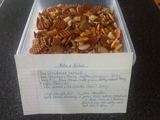 Mix together canola oil and ranch dressing and pour over above ingredients in large container. Shake periodically and eat next day.