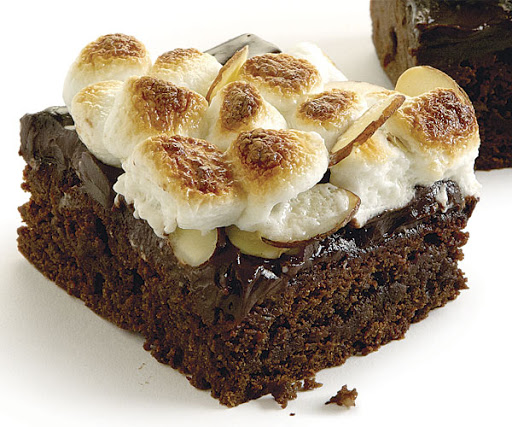 Position a rack 6 inches from the broiler and heat the broiler on high. Cover the ganache with the marshmallows and almonds. Broil, rotating the pan every 20 seconds or so to keep the marshmallows from burning, until browned. Using a knife, free the marshmallow topping from the sides of the pan. Let the brownies cool in the pan until the ganache is set, at least 1-1/2 hours. Using the foil overhang, remove the brownies from the pan and cut into 16 squares (use a wet knife to keep the marshmallows from sticking).