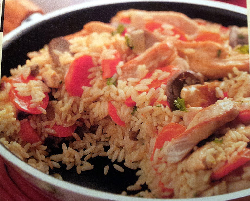 In a large skillet, brown chicken in butter until no longer pink. Remove and keep warm. In the same skillet, add the rice, carrots, onions, mushrooms and red pepper. Cook and stir until rice is browned and onion is tender.