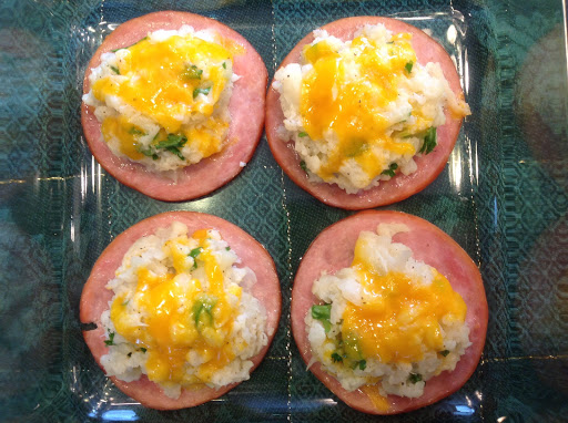 Fill Canadian bacon cups with cauliflower mixture. Top each cup with cheddar cheese. Bake for 15 minutes (I only baked for 5-10 and that was plenty - perhaps would have needed longer if using the muffing tin).