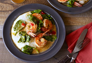 In a large sauté pan, heat oil until shimmering. Add remaining 4 Tbsp. green onion, remaining 2 tsp. garlic, and green and red bell pepper. Sprinkle with spice mixture and sauté until vegetables have softened, about 5 minutes. Add shrimp and sear on one side, about 1 minute. Flip shrimp and add reserved sauce, remaining 2 Tbsp. butter, and cream and bring to a simmer. When shrimp are pink on both sides, about 2 minutes, add spinach a handful at a time, stirring to coat with sauce. When spinach has wilted, remove pan from heat, stir in lemon juice, and serve immediately over Cheddar grits.