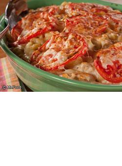 Add cheese sauce and tuna to pasta in pot; toss until evenly mixed. Transfer mixture to prepared baking dish. Arrange tomato slices on top, overlapping if necessary. Sprinkle with remaining cheese.
