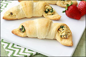 Separate the 8 portions of dough, and lay them on a dry surface. Slightly stretch or roll each piece into a larger triangle. Evenly distribute egg scramble among the bases of the triangles. One at a time, beginning at the base, tightly roll up each piece of dough over the egg scramble to form a crescent. (If needed, press to seal.) Transfer crescents to the baking sheet.
