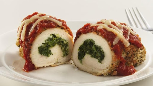 Spread about 1 tablespoon spinach mixture over each chicken breast; roll up tightly.
