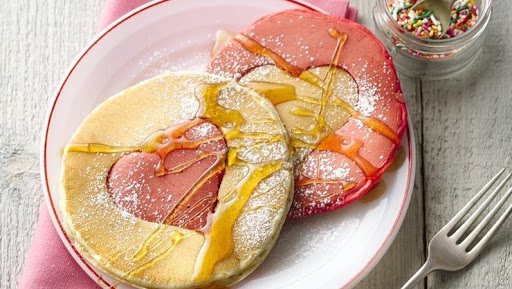 4 Using 3- to 3 1/2-inch heart-shaped cookie cutter, cut one shape from each warm pancake. Place cutout shapes in opposite color pancakes. Decorate with powdered sugar and candy sprinkles.