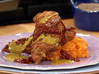 Serve topped with a drizzle of honey mustard or barbecue sauce and Smashed Sweet Potatoes with Honey (below) alongside.