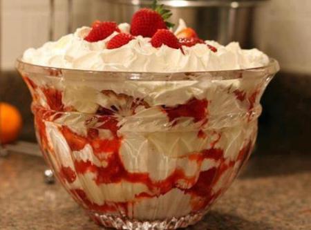 Tear angel food cake into medium pieces. Begin layering cake, strawberries, pudding and whip cream in a large clear glass bowl.Continue irregular layers, filling the bowl. Top entire dessert with a solid layer of whip cream. Slice a few fresh strawberries for garnish Refrigerate overnight or at least 4 hours before serving. To me it tastes like all the flavors of strawberry shortcake in one big yummy bite!