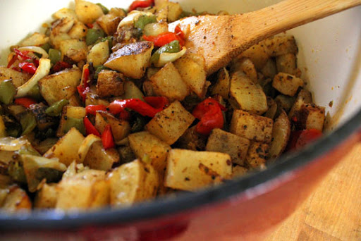 Heat a skillet over medium-low to medium heat. Next, put a tablespoon of canola oil in the skillet. Add in some butter and the onions and saute until they start to turn brown. Next, throw in the cooked diced potatoes and the peppers. Salt and pepper the potatoes, then stir them around, slightly pressing/packing them in the skillet. Cook without stirring for 5 to 7 minutes. You want to make sure the pan is hot enough to crisp the potatoes. Add more butter to the pan as necessary for moisture.