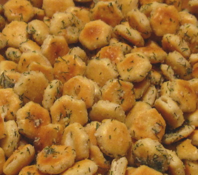 Mix dry ingredients; add crackers and mix well; pour oil over mixture and stir to mix.