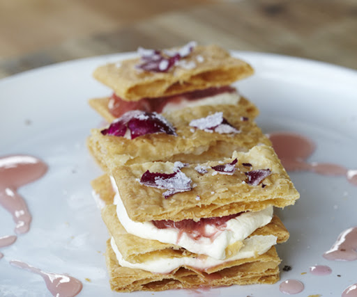 Gently spread 1 Tbs. of the whipped cream mixture over each of two puff pastry pieces. Stack the pieces, cream side up on a dessert plate. Spoon several pieces of the poached rhubarb over the top cream and drizzle with 1 Tbs. of the rhubarb syrup. Top the rhubarb with another piece of pastry. Repeat with the remaining puff pastry pieces on seven more dessert plates.