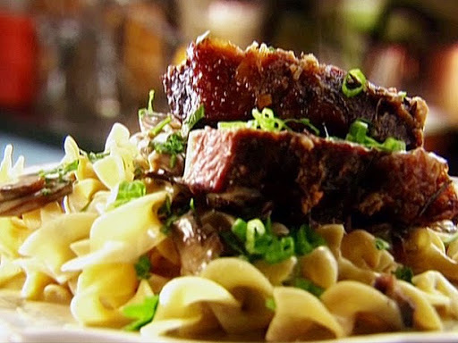 To serve: Pile the noodles high on a plate, top with stroganoff sauce and finish with rib slices. Garnish with fresh parsley and green onions.