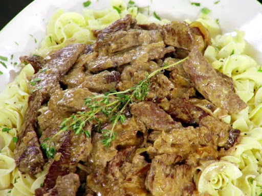 Cut the beef against the grain into narrow 2-inch long strips about 1/2-inch thick. Pat dry and season with salt and pepper, to taste. In a large saute pan, heat 2 tablespoons of the infused olive oil over medium-high heat. Add the prepared beef and brown on all sides, about 3 to 5 minutes. Remove the meat from the pan and set aside. Add another tablespoon oil to saute pan, if needed, and add the onions. Cook until light golden, stirring and adding 1/4 cup of beef stock to deglaze the pan. Stir in the remaining beef stock and the beef with any resting juices back to the skillet and simmer for 10 minutes. Stir in the sour cream and just heat through, do not boil. Taste for seasoning and adjust, as necessary. Transfer the stroganoff to a serving platter and serve. Enjoy!