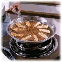 Combine the butter, sugar, and cinnamon in a flambé pan or skillet.