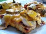 Stack bacon across each breast, spoon mushrooms on each breast and then approx 1/3- 1/2 cup cheese on each.