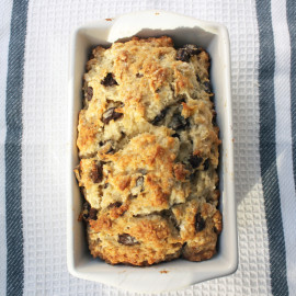 4. Pour the batter into a loaf pan or 2 mini loaf pans. Bake for 45-50 minutes (big loaf) or 25 minutes (small loaf). Since heat varies by the oven, you should check the loaves using the toothpick method. When it’s golden on top and toothpick comes out clean, it’s done. Enjoy!