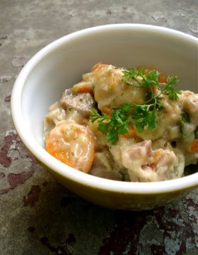 Form dumplings into little balls. Now add the dumplings and sprinkle in the onion powder. Cook on low for about 5 minutes or until dumplings are slightly cooked. You can check them by removing one from the stew and cutting it with a butter knife, it shouldn't fall apart. It should be tender but not too dry in the center; don't overcook or it'll get tough. Add salt and pepper to taste.