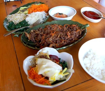 Bibimbap (BEE-beem-bop): One of the most popular dishes in Korean cuisine, bibimbap is a nutritious rice dish of steamed rice and pre-cooked vegetables (usually spinach, bean sprouts, carrots, mushrooms, egg and lettuce. It can also contain ground beef but can be ordered without meat. Dolsot bibimbap is the same dish served in a hot stone pot (the pot is pre-heated in oven) to make the rice on the bottom crunchy and to keep the dish hot for a longer time.