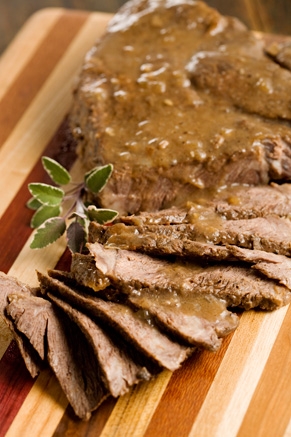 *Cook's Note: If the gravy is not thick enough, remove the meat from the pan and pour the gravy into a saucepan. Bring to a boil and thicken it by adding 2 tablespoons of cornstarch mixed with 1/4 cup cold water, stirring constantly.