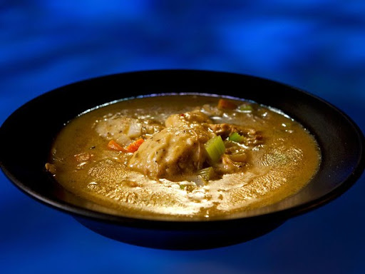 Using 2 dinner spoons, shape the dough into golf ball-size, quenelle shaped biscuits and drop them into the hot soup. Cover with a tight fitting lid and allow the dumplins to cook for 15 to 20 minutes over low heat.