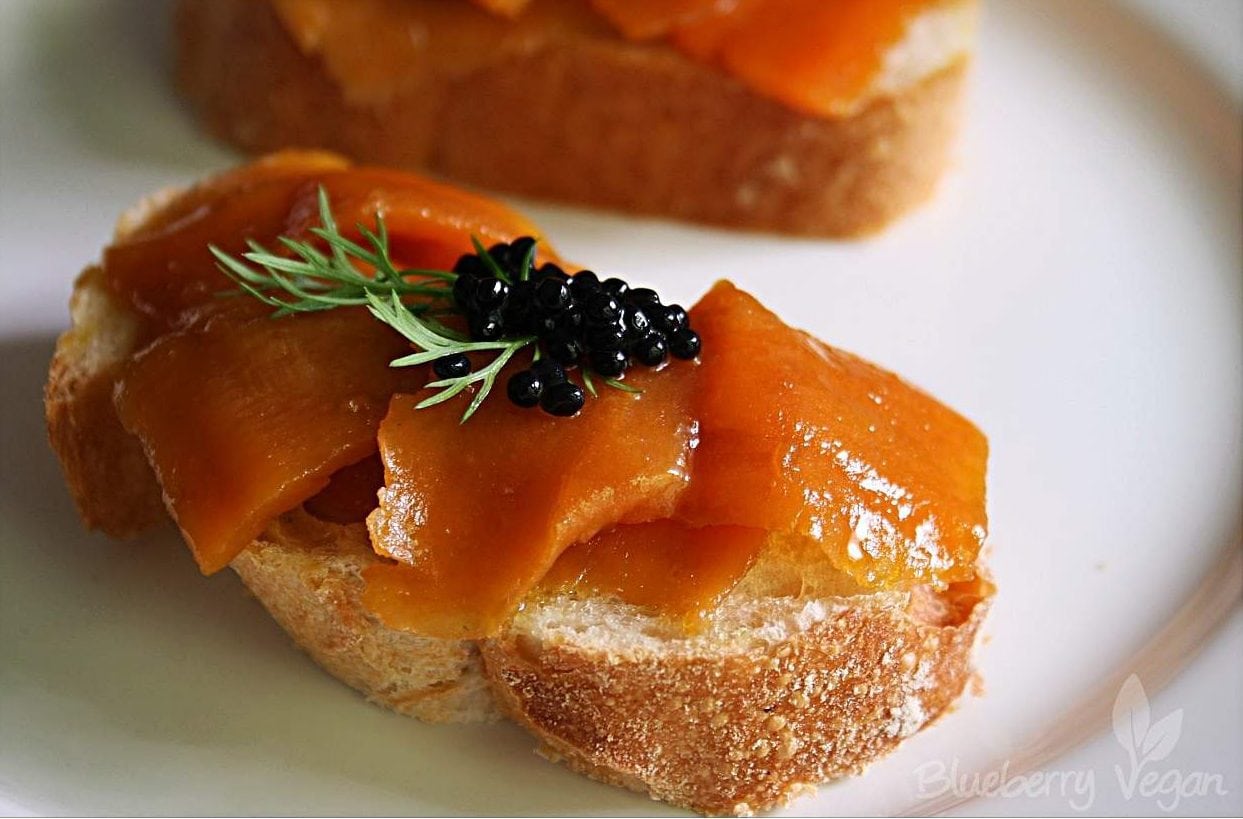 Dress the carrot lox on toast, baguette or bagels and garnish with fresh dill.
