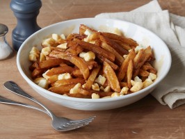 In a deep-fryer set to 250 degrees F, blanch the fries in oil for about 2 minutes. Remove the fries and let them rest for about 5 minutes. Then, fry them again for about 2 minutes or until golden brown. Place on a paper towel-lined baking tray to absorb the excess oil. Salt and pepper the fries while hot. Remove the sauce from the stovetop and strain. Plate the fries in a shallow bowl, pour sauce on top and garnish with cheese curds.