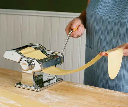 Cut the dough into 6 pieces and cover with a towel. Pass one section at a time through a pasta machine. Start on the widest setting and pass the dough through. Begin lowering the machine’s setting down one notch at a time, and pass the dough through once on each setting, finishing on the last (thinnest) setting.