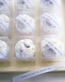 Pastelitos de boda (literally, "wedding cookies") are a traditional dessert at Italian weddings. Made with walnuts, pecans, or almonds, they're a sweet way to thank guests for sharing the day. To give as favors, tuck two into a tiny clear box along with a note imprinted with a fitting sentiment or your wedding date. Type on a computer, print on colored vellum, then cut the messages into tiny strips.