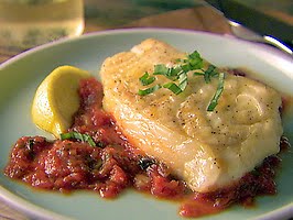 Wipe out the pan with a paper towel and heat the remaining 3 tablespoons olive oil over medium heat. Add the garlic, tomatoes, water, parsley, 1/4 teaspoon salt, and 1/2 teaspoon pepper and cook at a simmer for 10 minutes. Add the basil and the fish and heat for 2 minutes. Serve immediately.