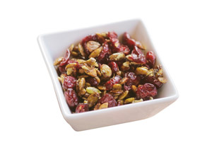 In a large bowl, toss pumpkin seeds with dried cranberries. Store in an airtight container in a dry, cool place.