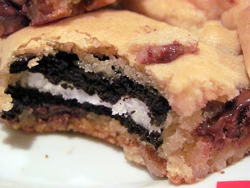 Press half of the dough into the bottom of the prepared pan. Lay the cookies on the the dough and press down. Press the remaining dough on top of the cookies. The whole top may not be covered. Just make each cookie is encased in dough.