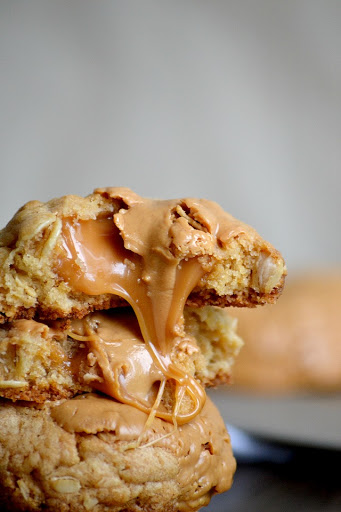 Brown Butter Oatmeal Cookies Filled with Caramel and Peanut Butter
