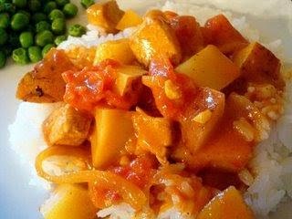 Heat oil, curry powder, and paprika in a large skillet over medium-low heat for two minutes, until fragrant (but don't let it burn).