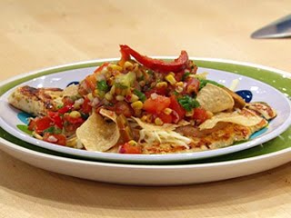 7. Top chicken with warm refried bean dip, a handful of shredded cheese, a handful of tortilla pieces, lots of Pico de Gallo salsa with corn and some pickled jalapeño peppers.