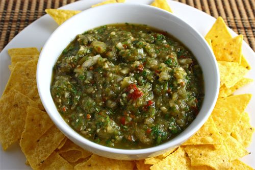 Broil in the oven until the tomatillos are blackened all over and the jalapeños skin is blackened (if using roasted green chiles, this step is already done; if using fresh chiles, roast as directed for jalapeños). You may have to remove the peppers from the oven before the tomatillos. (Feel free to remove the charred outer skins first.)