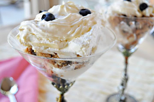 Quickly dip each cookie in shallow bowl with liqueur, break in large pieces. Place half of dipped cookies in bottom of two dessert dishes.