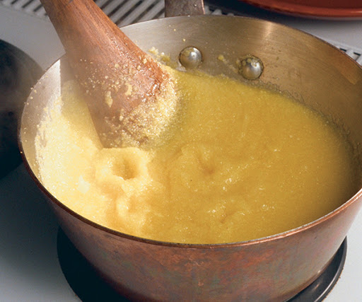 Using the coarse holes of a box grater, grate the corn directly into an oven-safe, 2- to 3-quart, heavy-duty saucepan. Add the milk and water and bring to a simmer over medium heat. Slowly sprinkle in the polenta, whisking constantly (do not add quickly and all at once or it will become lumpy), until the mixture just begins to thicken, about 2 minutes. Cover pan tightly with a double layer of foil or a tight fitting lid, place in the oven, and bake for 45 minutes.