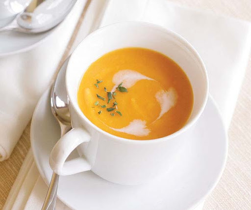 If necessary, reheat the soup in a clean pot. Ladle the soup into bowls, drizzle with the reserved coconut cream, and sprinkle with the lightly chopped thyme.