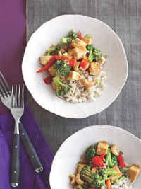 Heat the remaining 1 teaspoon oil in the skillet. Add the pepper and cook, stirring occasionally, for 1 minute. Add the ginger and garlic and cook for 30 seconds, or until fragrant. Stir in the broccoli and tofu, and cook for 1 1/2 minutes, or until hot. Stir the soy sauce mixture to recombine and add to the skillet along with the cashews. Cook, stirring, for 1 minute. Remove from the heat and stir in the scallions. Serve over the rice.