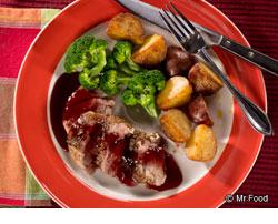 Meanwhile, in a small saucepan, combine raspberry preserves, vinegar, and brown sugar; cook over low heat until sauce is melted and hot. Slice pork and serve with sauce.