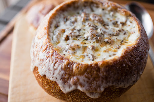 Philly Cheesesteak Stew with Sauteed Mushrooms and Onions, served in a Sourdough Bread Bowl topped with Melted Provolone