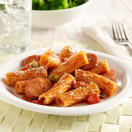 An easy, tasty pasta dinner made with real ingredients—no flavor packets here! Smoked turkey sausage, rigatoni, green peppers, and tomato sauce.