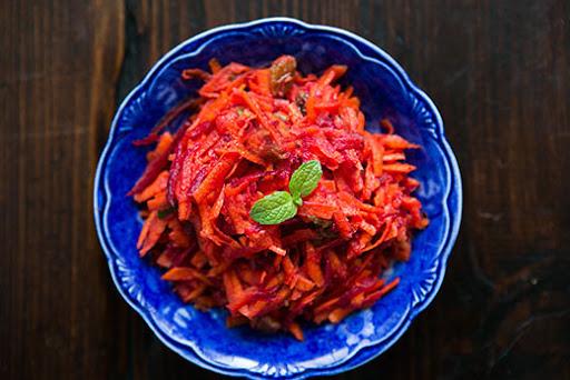 1 Place the grated carrots in a medium sized serving bowl. Place the grated beets into a sieve and briefly rinse with cold water. This will rinse away a little of the excess beet juice that may otherwise color the whole salad beet red. Pat dry with a paper towel. Then add to the bowl with the carrots. Add the raisins. Stir to gently combine.