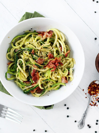 Remove all of the oil from the bacon except for 2 tbsp. Add in the garlic and red pepper flakes and cook for 30 seconds. Then, add in the zucchini noodles and toss to cook, for about 2-3 minutes.