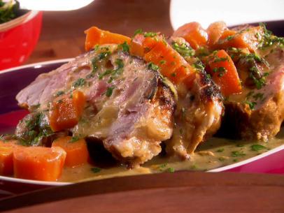Add the carrots and onions to the pan and cook until the onions are translucent and the vegetables are softened. Add the flour and stir to mix. Deglaze with the wine, and add the roast back into the pan along with the chicken stock and thyme. Season with salt and pepper. Cover and simmer on low for 1 hour 30 minutes.