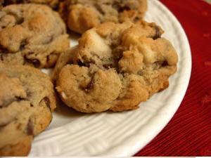 3. Add the nuts and chocolate chips. Spoon the dough in walnut-sized mounds onto ungreased cookie sheets.