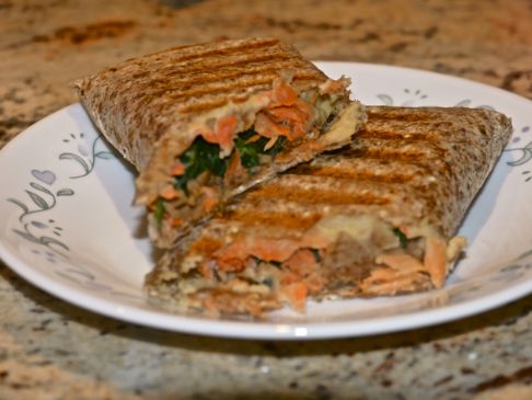 spread hummus on whole grain tortilla, place salmon slices and spinach on top. Roll tortilla and eat cold or grill in a panini press! enjoy!